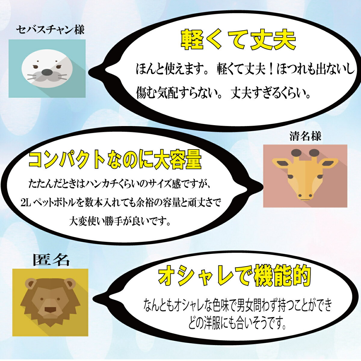 そんな声を多数いただいております! ハンカチほどにまで小さくなる折り畳み式 2Lペットボトル8本が入る大容量(耐荷検査済み20kg) 安定感をプラスする開口部のボタン 買い物の量が多くて大容量のものを探している方 良くエコバッグを忘れてコンビニ袋を買ってしまう方 肩にかけて重さを感じにくくしたい方 こんにちは!店長の永田です。
